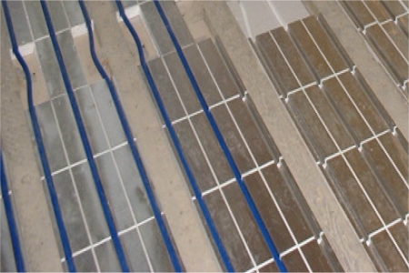 Nadat alles goed is voorbereid en de platen + buizen zijn gelegd zullen de EPS panelen gelijk liggen met de bovenzijde van de draagbalken en ervoor zorgen, dat de vloerafwerking in direct contact met de aluminium warmtegeleiders. Deze zorgen voor