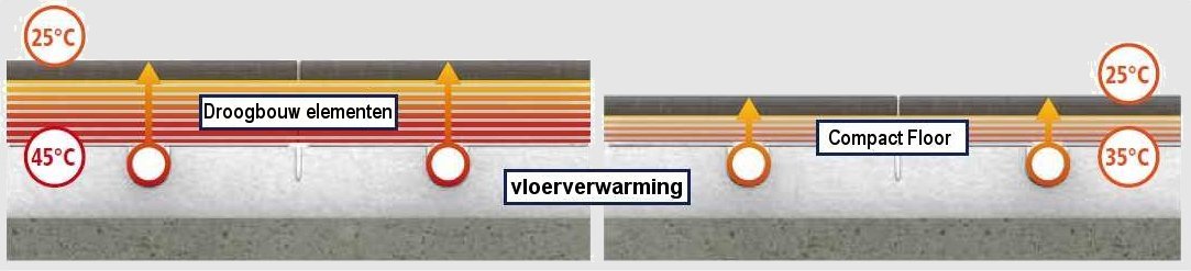 Hierboven een vergelijking tussen een vloer met Compact Floor (rechts) en een vloer bedekt met een conventionele dekvloer (links). Om een aangename oppervlaktetemperatuur van 25o C te bereiken, kan volstaan worden met een warmwater temperatuur van zeker 10oC lager.