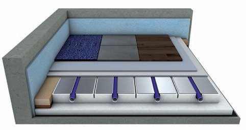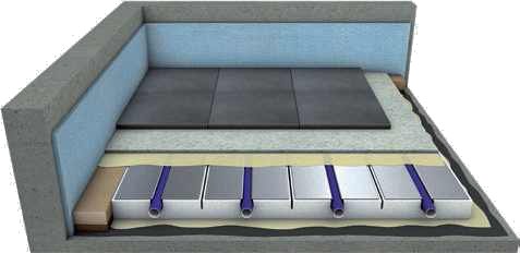 Het Systeem Qualitherm EPS bestaat uit Expanded polystyreen elementen (240Kpa) met aluminium lamellen erop verlijmd, met een voorgevormde omega sparing waar de 16mm meerlagen verwarmingsbuis exact in past. |