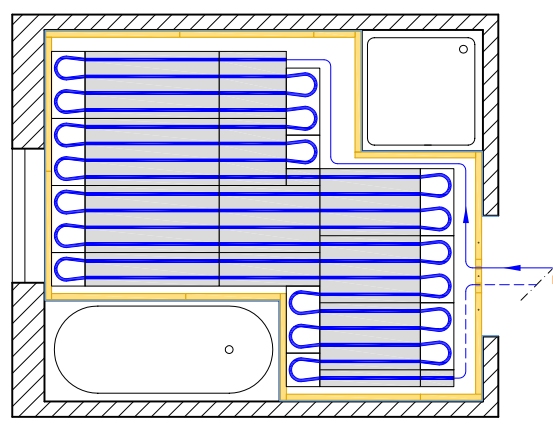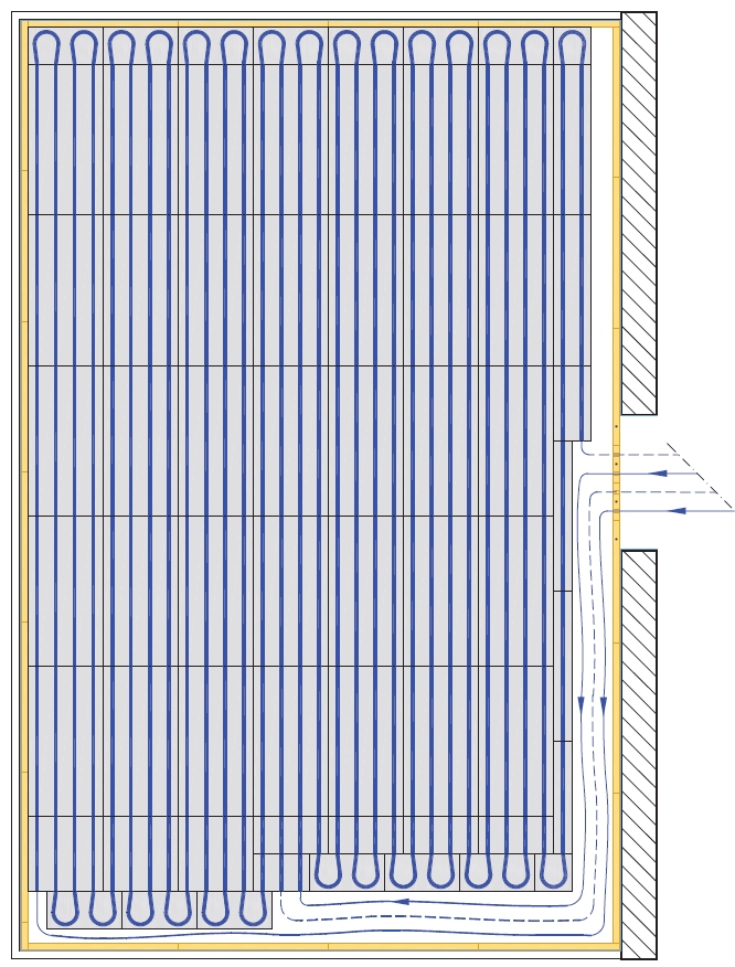 10. Geleid de verwarmingsbuizen naar de verdeler. ONbedekte plaatsen en groeven in de blanco elementen kunnen eventueel met aluminium platen worden bedekt.