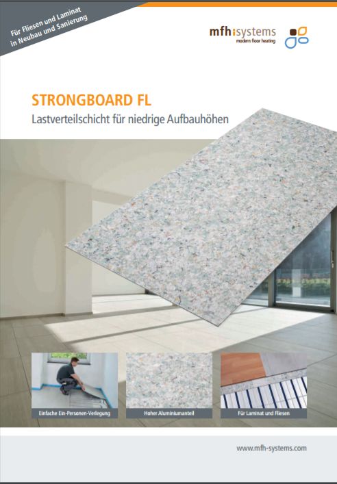Door zijn lage gewicht van 5,2 kg per m² is het systeem ook geschikt voor statisch gevoelige plafondconstructies. Als een ladingsdistributielaag wordt STRONGBOARD gebruikt als een nuttige lastverdelingslaag voor tegelbekledingen en voor zwevende laminaatvloeren. De elementen, die slechts 5 mm dik zijn, worden vastgelijmd aan de verwarmingselementen, die ook met identieke lijm (Ecofix) aan het substraat worden bevestigd.
